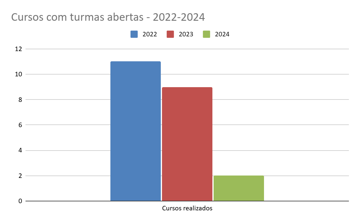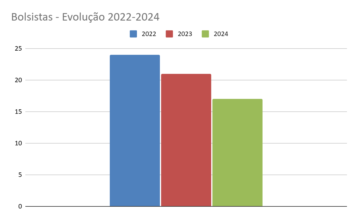 O número de bolsas de extensão apresentou significativa redução no período de 2022 a 2024 — de 24 em 2022, passando por 21 bolsas distribuídas em 2023 e fechando em 17 em 2024. Demanda atenção sobre a distribuição de bolsas para o biênio 2025/2027, uma vez que a expectativa é de crescimento em número de projetos.
